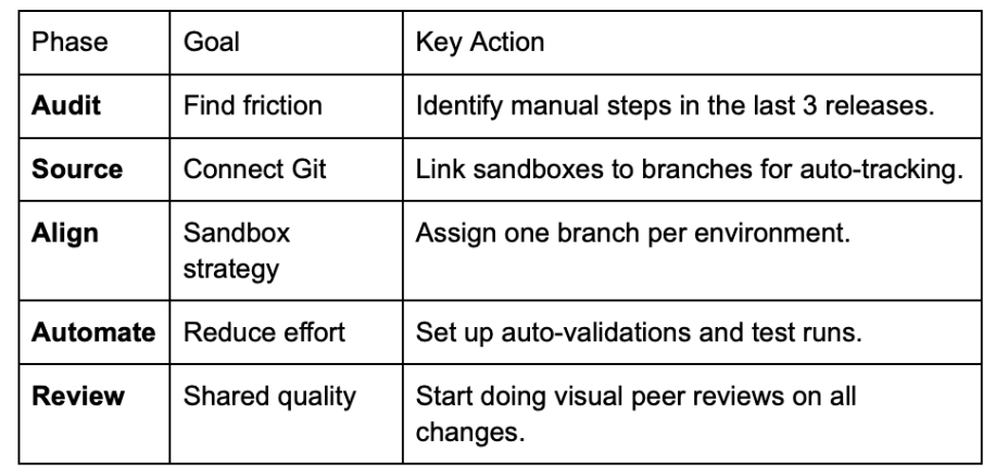 First, look at metadata tracking . Are people still using spreadsheets to track changes? This is a major source of error.Second, look at environment drift. Do your sandboxes look like your production org? If not, deployments will always be painful.Third, look at the handoff . How do Admins give their work to Developers? If it requires a manual document, you have a friction point.If you have friction in one (or more) of these areas, no need to worry! You cannot improve what is unmeasured.