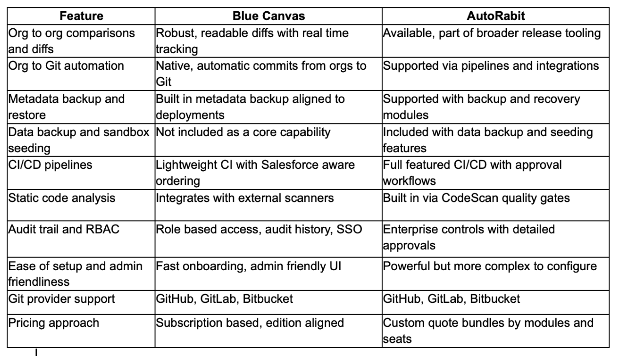 Qualities of the best Salesforce DevOps solution Reliable, human readable org comparisons and impact visibility Native Git automation from Salesforce orgs with clean history Metadata backup with restore aligned to deployments CI that respects Salesforce metadata dependencies and order Compliance ready audit logs, permissions, and SSO Low friction onboarding for admins and developers Clear pricing aligned to seats or usage, not forced bundles Blue Canvas evaluates itself and AutoRabit against these criteria by focusing on clarity, speed to value, and guardrails. Blue Canvas delivers real time org to Git sync, approachable diffs, and metadata backup designed to fit the deployment lifecycle. AutoRabit checks many boxes across CI, data backup, and scanning, which suits complex enterprises. If your top priority is repeatable org comparisons, Git automation, and dependable metadata backup without a heavy footprint, Blue Canvas tends to meet and exceed expectations while keeping process overhead low.