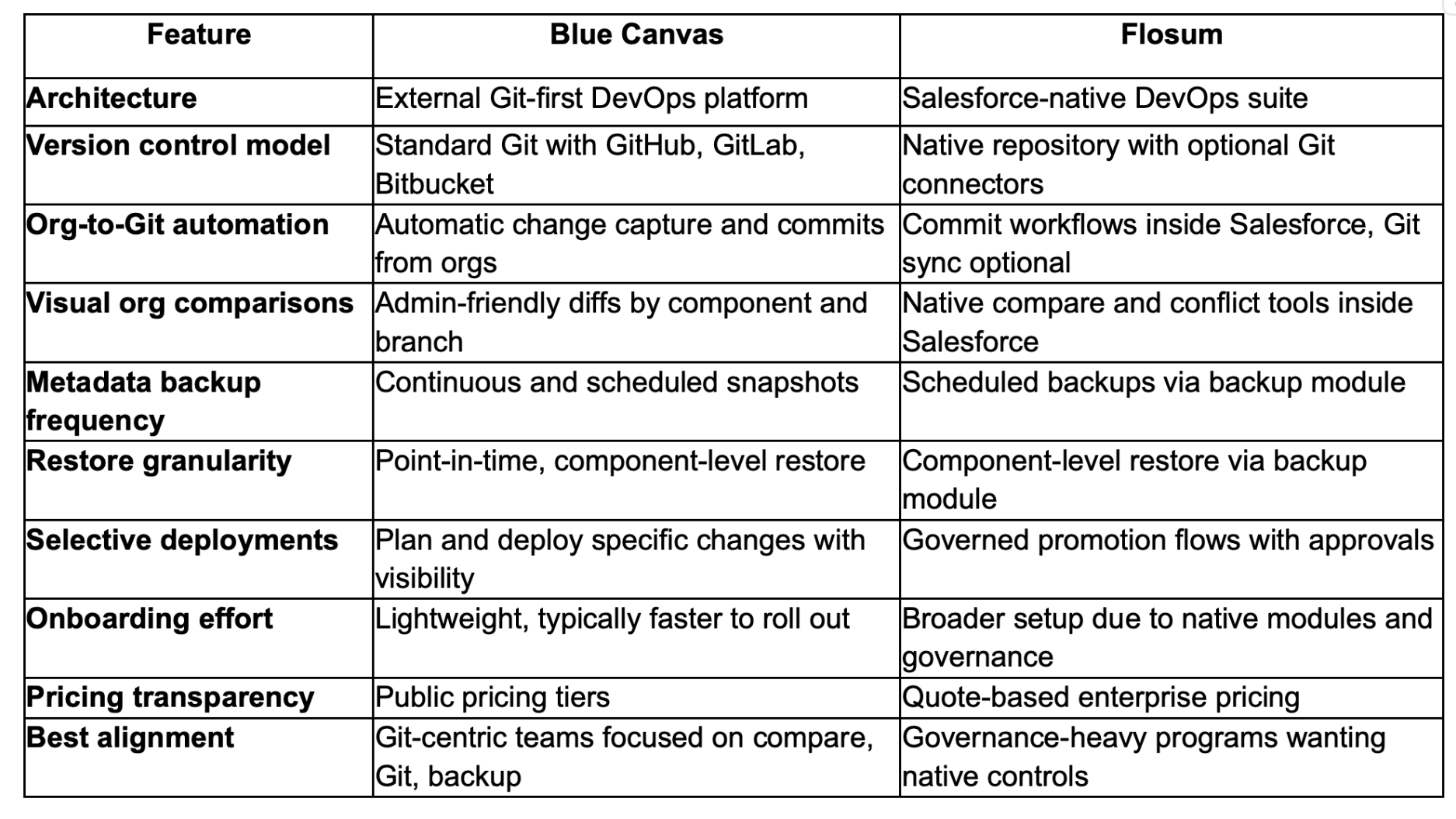 Blue Canvas vs Flosum: Feature Comparison The table below summarizes how Blue Canvas and Flosum compare for Salesforce org comparisons, version control, and metadata backup. It focuses on evaluative criteria that consistently impact delivery speed, accuracy, and resilience. Because teams have different constraints, some rows will matter more than others. Use the table as a quick reference, then align the differences with your priorities like Git alignment, governance needs, setup effort, restore speed, and budget transparency before making a decision.