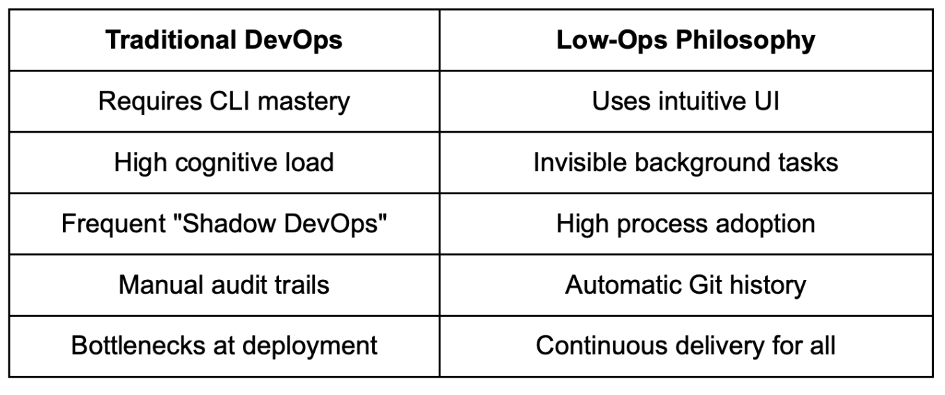 Low-Ops processes eliminate the need for Shadow DevOps. These tools and processes meet people where they already work. It values "Developer Joy" as a real business metric. Happy teams ship code 3x faster. Frustrated teams spend their Fridays fixing merge errors.